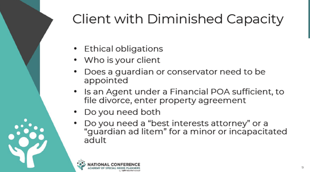 <p><span style="font-size:14.0pt"><a href="https://cdn.elderlawanswers.com/common/uploads/photos/20482-Clients with Diminished Capacity Slide.png" target="_blank"><img alt="Client With Diminished Capacity: Ethical obligations. | Who is your client? | Does a guardian or conservator need to be appointed? | Is an agent under a financial P O A sufficient to file divorce and enter a property agreement? | Do you need both? | Do you need a 'best interests' attorney or a 'guardian ad litem' for a minor or incapacitated adult?" src="https://cdn.elderlawanswers.com/common/uploads/photos/20482-Clients with Diminished Capacity Slide.png" style="float:right; height:200px; margin-left:10px; margin-right:10px; width:361px" /></a>This past spring, an Academy of Special Needs Planners 2024 National Conference session led by <a href="https://www.phoenixlawteam.com/blog/kile-law-firm-joins-forces-with-mushkatel-robbins-becker/" target="_self">Emily Kile</a> of Kile Law Firm, PC offered attendees guidance on navigating the sorts of unique challenges that come up in divorce cases where the children or spouses have a disability.</span></p>