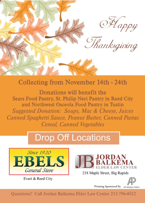We’re thrilled to kick off this season of giving with drop-off locations at Ebels General Store in Evart and Reed City, as well as the Jordan Balkema Elder Law Center in Big Rapids.